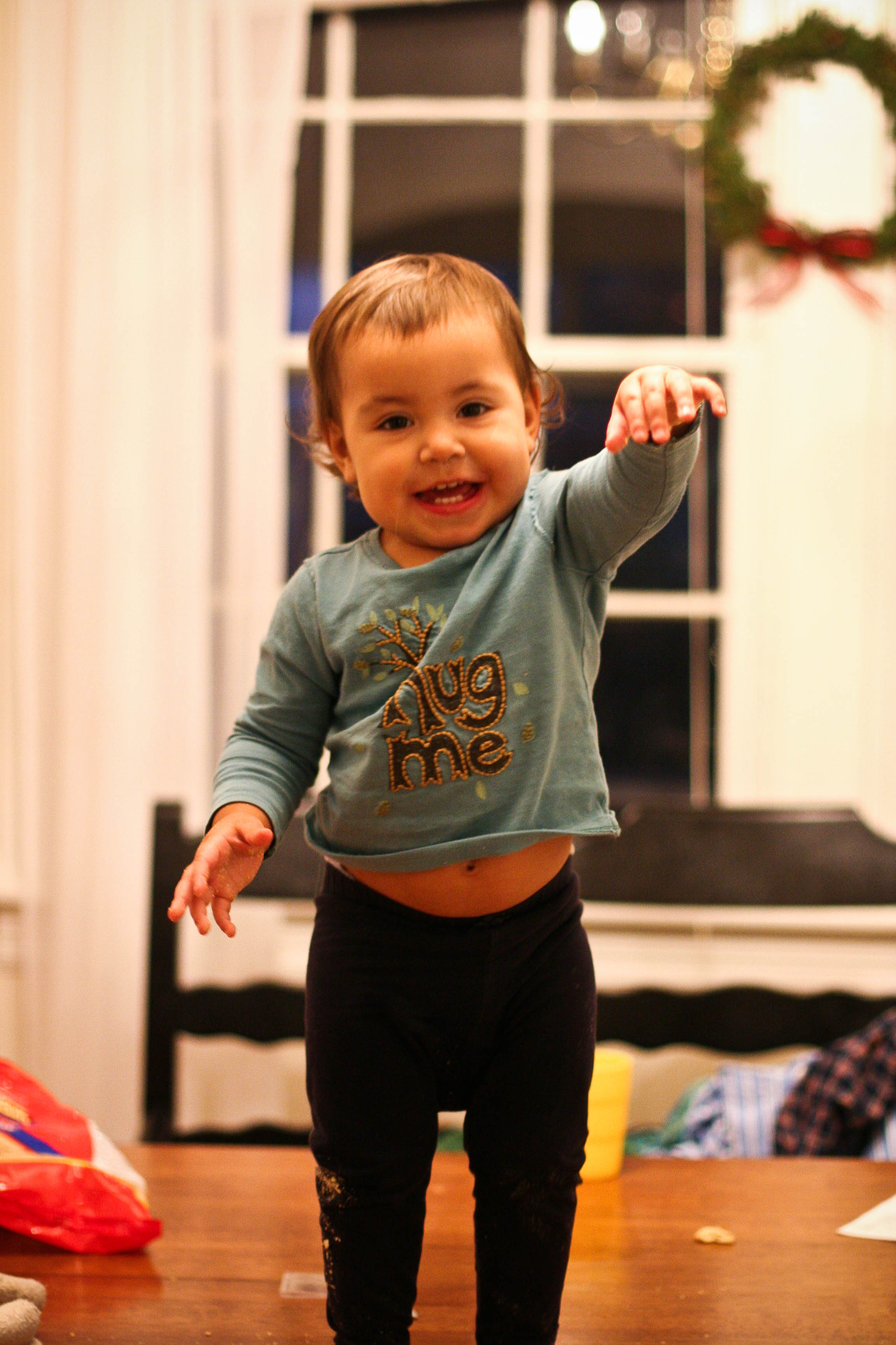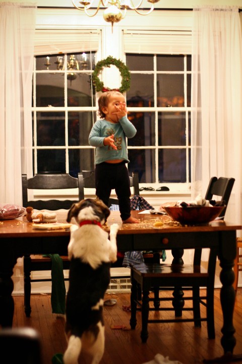 I couldn’t keep Lyra off the table. Here she is looking triumphant. Seconds later she dumped an entire bag of animal crackers on the table which she pushed to the edge so the dog could reach.