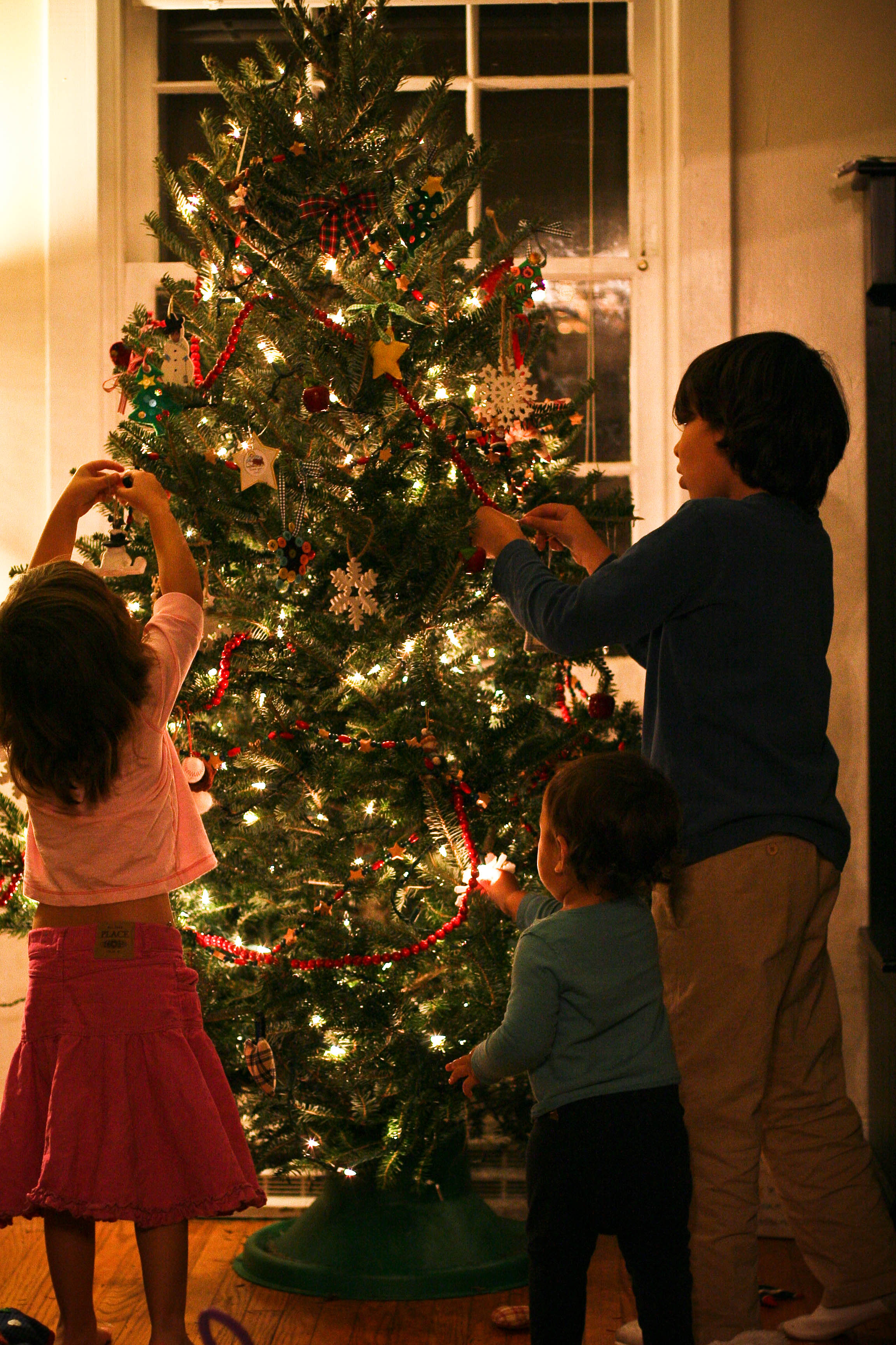 We went to two stores, one didn’t have tree stands and twine so off we were to another five minutes before closing. No one could agree on a tree so we let Jorge pick as he was in the grumpiest mood that night. We got home too late to trim so that left us to decorate the next day but Jorge was working late and the kids could barely stand it. I decided to just start, getting the tree in the stand and putting on lights, it was positively comical.