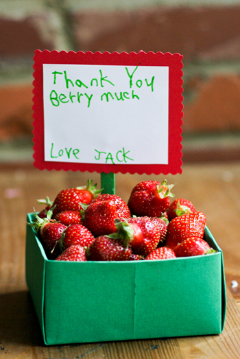 Now is our chance to say “Thanks!” to teachers, librarians, administrative staff, crossing guards, and janitors for all they do and how they care for our kids. You can even be sneaky about it. We just went to pick strawberries so we thought our teachers might enjoy some fresh picked goodness to go along with our thanks. We folded paper boxes and made signs that said “Thank You Berry Much!” which the kids thought was hilarious.