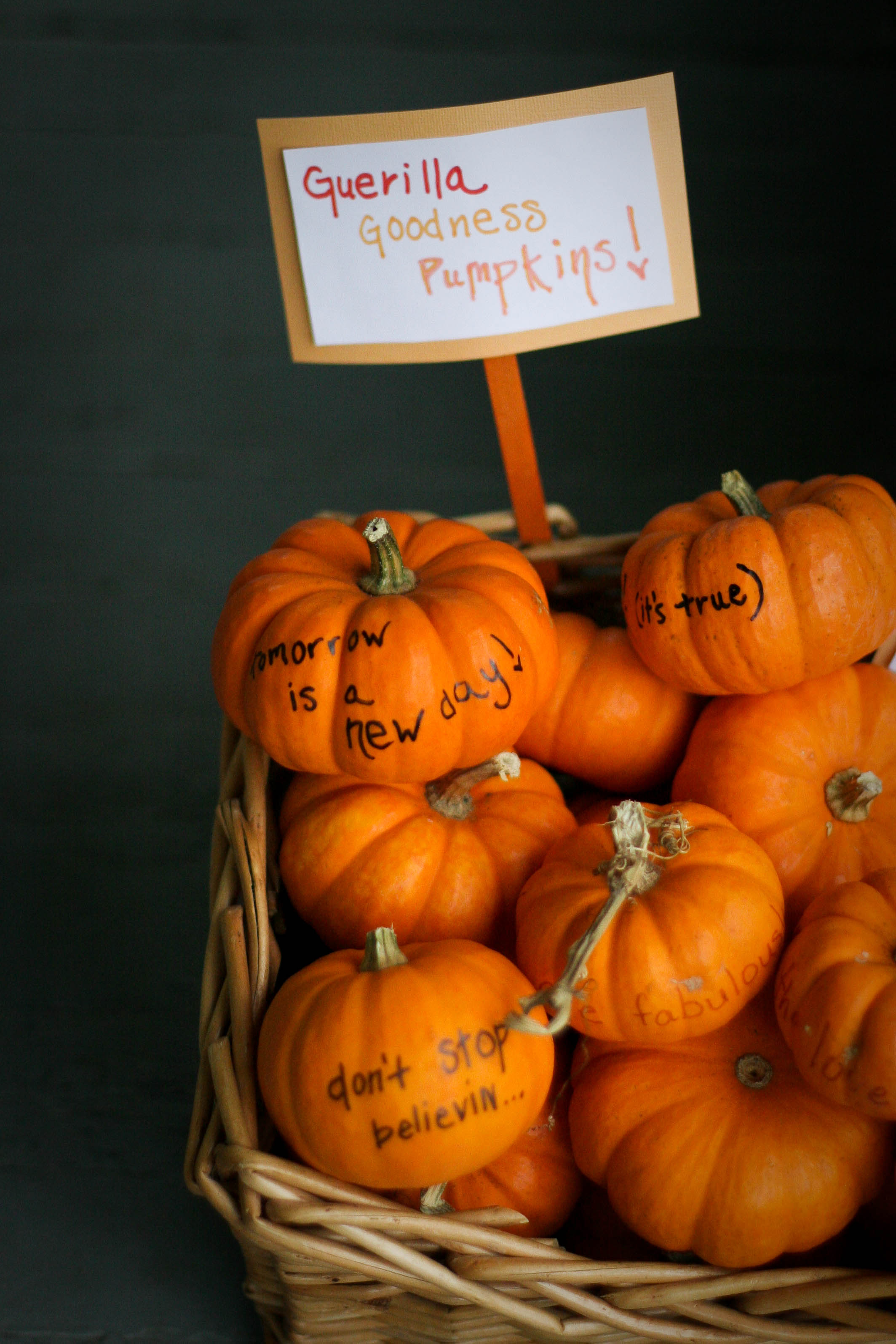 What to do with all those lovely left over gourds and tiny pumpkins from Halloween? Why not write a message on them and leave them in your neighborhood, city, local bus stop, grocery store aisle, park bench…and the list goes on. It’s finally gotten chilly here so I’ve been sliding one in my pocket every day when I go out and let the kids decide where we should leave it.