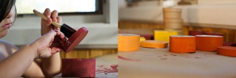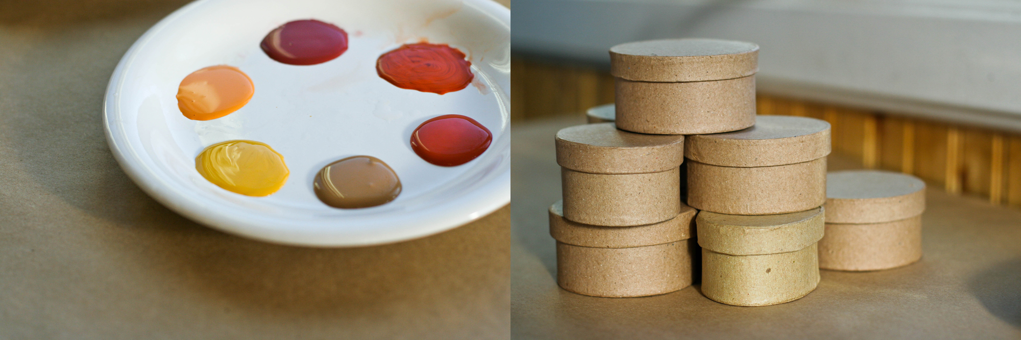 1. Get a lovely mix of fall colors, pick a few different shades of the same color. We chose these tiny boxes to paint.