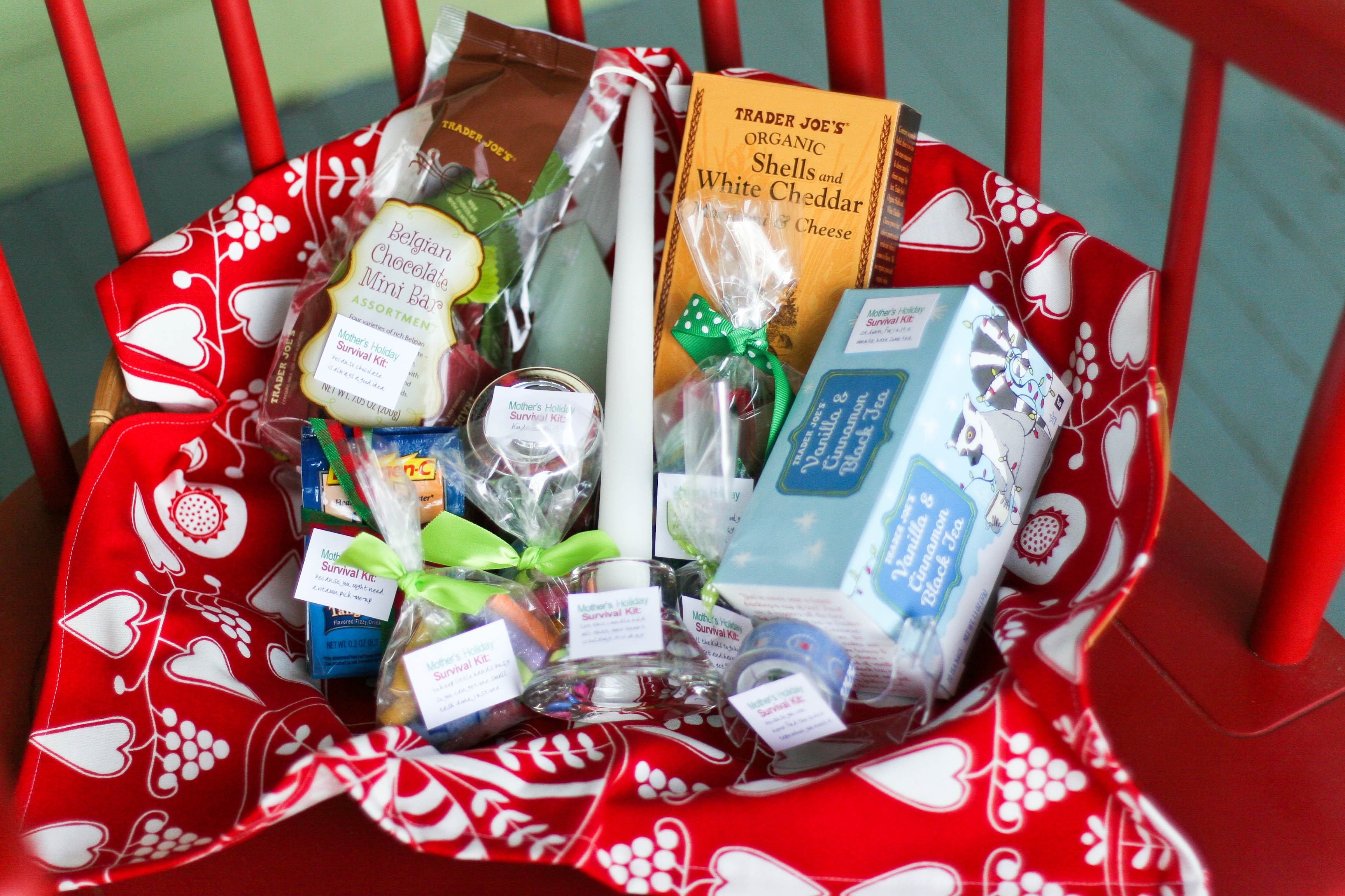 Such a great idea, and by chance, I just heard of a friend who does a “be nice to you” basket for her female/mother friends. The fifth of scotch is genius – maybe airplane bottles of Bailey’s or whatever the recipient’s poison of choice is? And perhaps a homemade CD of whatever your family’s favorite fun music is, somebody else is sure to find a new fave for dancing the wiggles out.