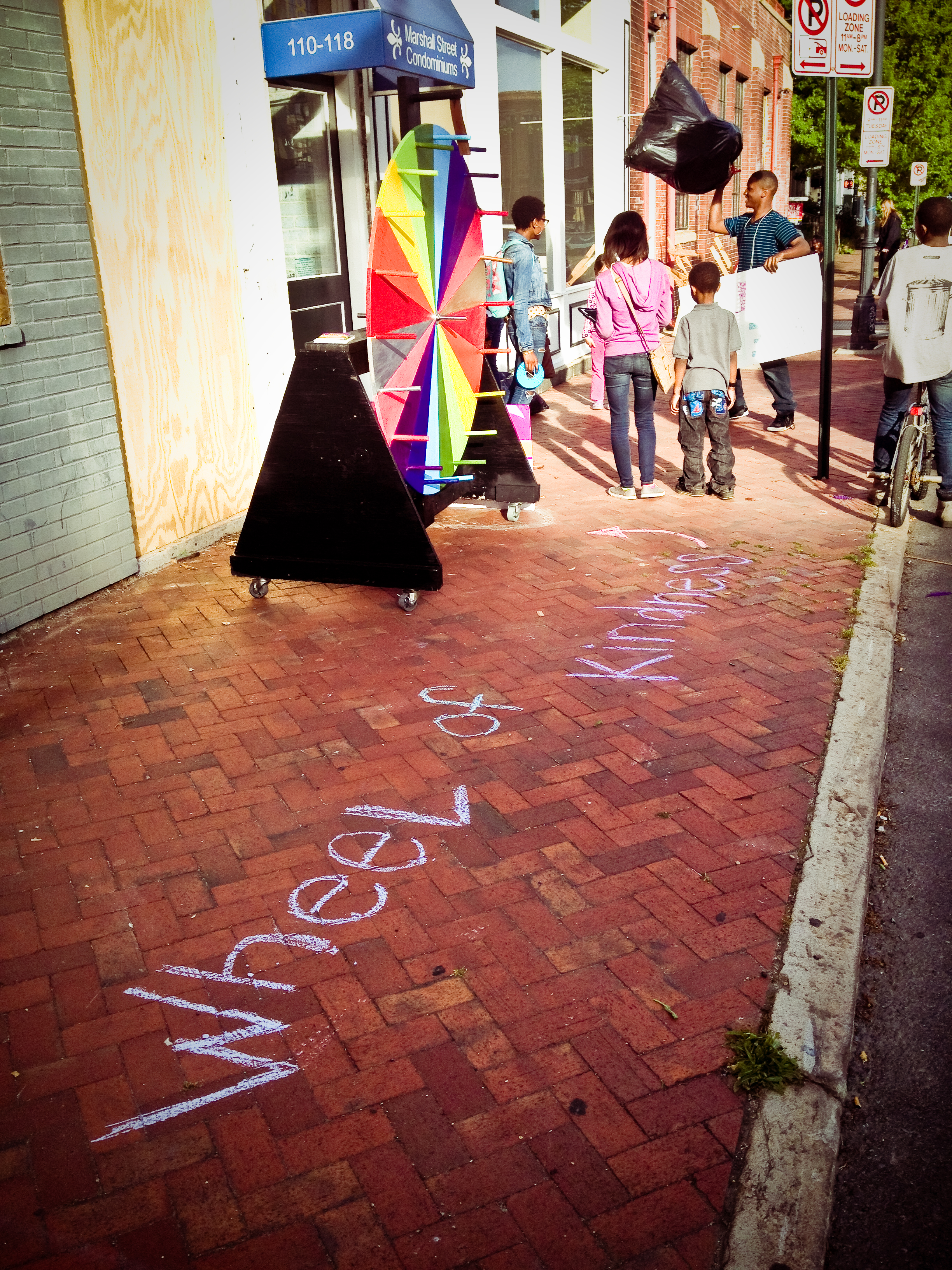 The kids invited folks walking by to play, I was amazed how many different kinds of people joined us…and I wish we had more pictures of their faces. It may be almost impossible to walk by a giant rainbow wheel and not want to spin it. You find yourself yelling things like “Come on!!! Big kindness, big kindness, no whammies!” and cheering for someone, anyone to land on the double dog dare GOLD triangle of kindness.