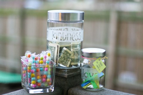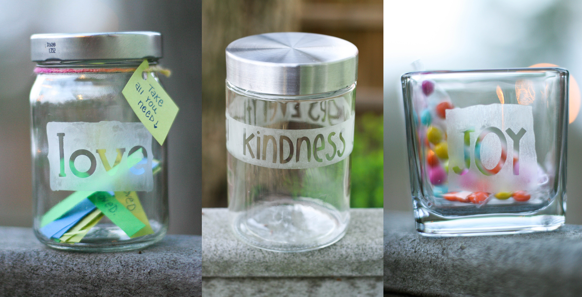 The idea popped back in my mind when we started the Swearing is Caring project. I thought the swear jar needed something special so we made a “Kindness Changes Everything” jar today. All you need is a jar, some letter stickers (lots can be found in the scrapbook section), and some etching cream. I made a few more because it’s hard to stop once you get started.