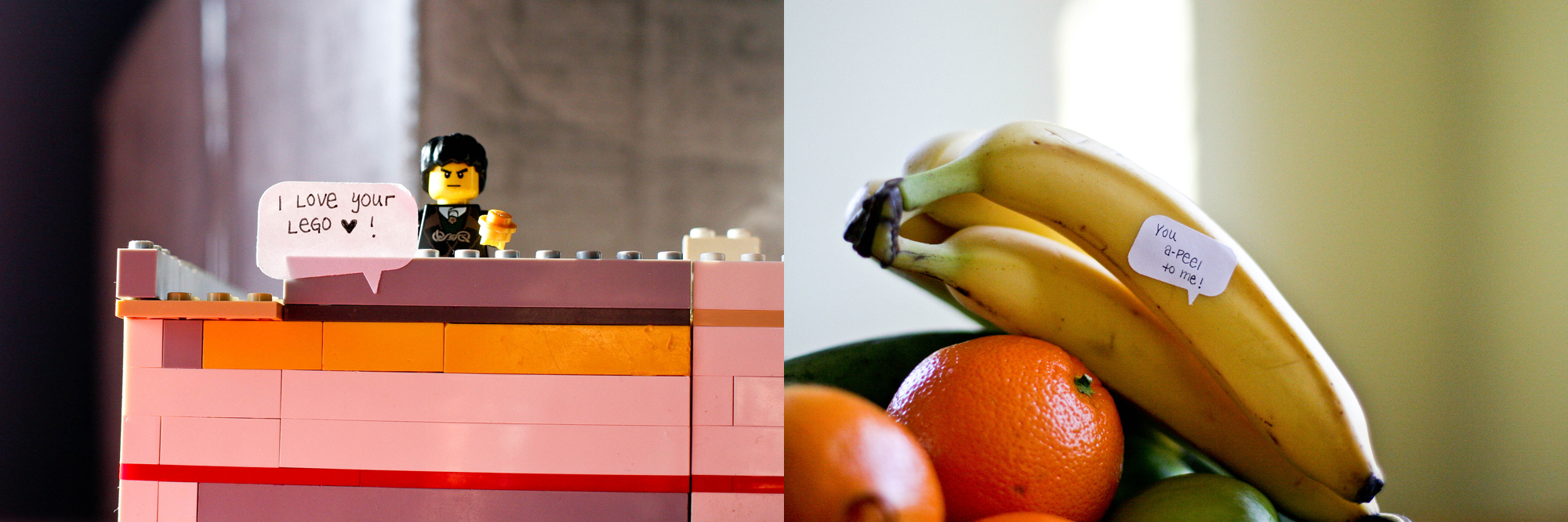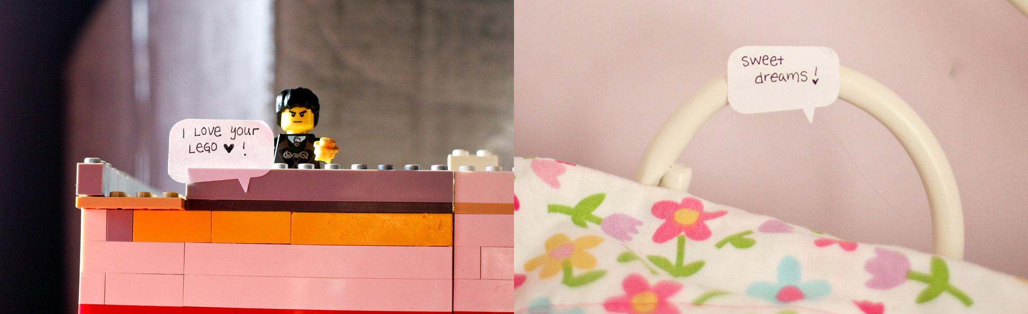 i love your lego heart! (on a lego creation):: sweet dreams! (on her bed)