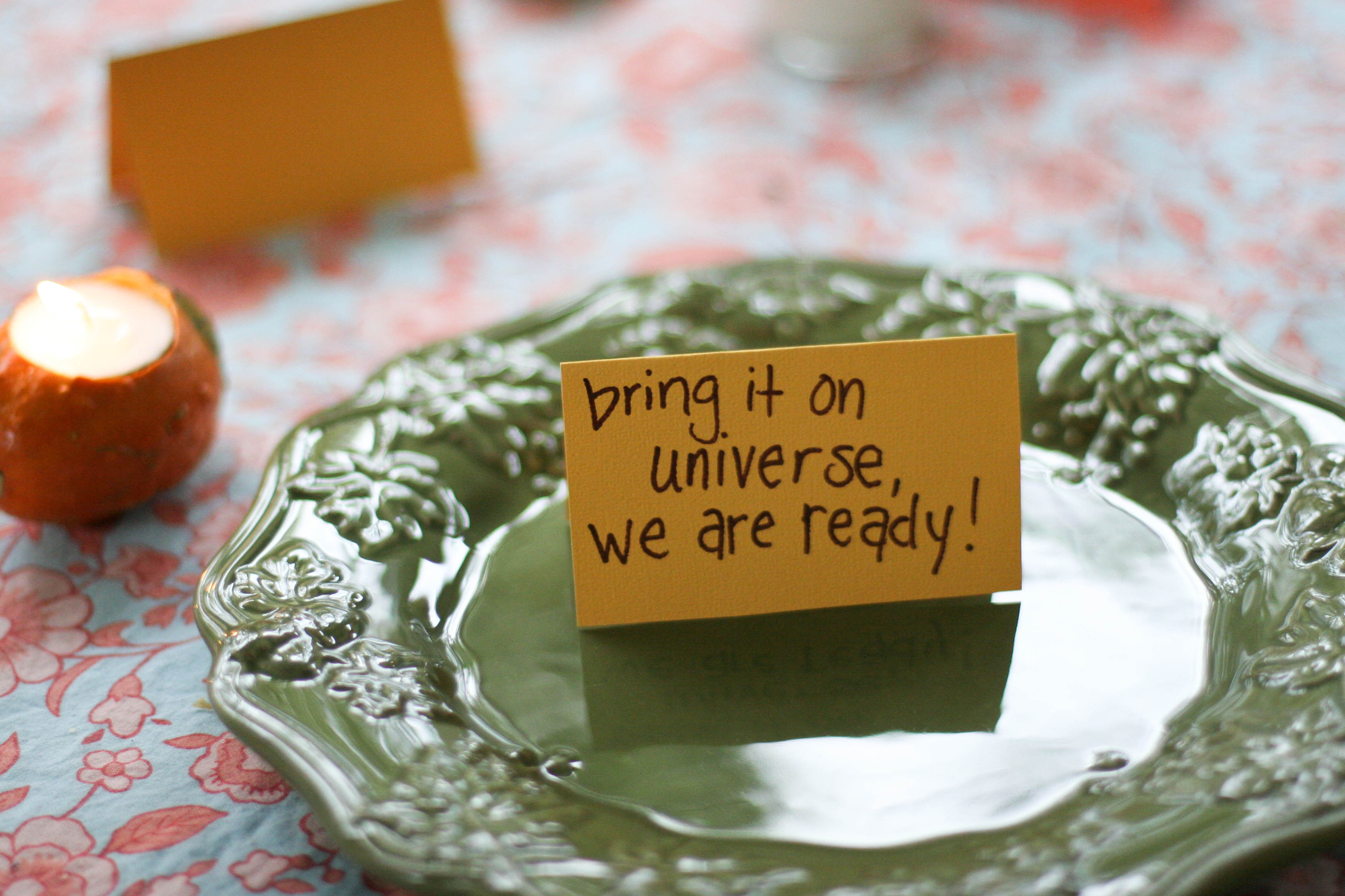 A dear friend brought a beautiful bouquet of flowers from the farmer’s market, I carved pumpkin and gourd votive candle holders, we made homemade pizza with pepperoni stars and I wrote messages left on each plate.