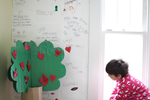 Shockingly, there was very little drama in the whole project…and you should know there is always a little in every bit of family togetherness. We wrote something we loved about each person in our family on the cherry hearts and put it in the corner. I never know what to do with such things when we are done. I only know they are important to do. This makes for very un-grown up house decor, but I don’t mind so much.