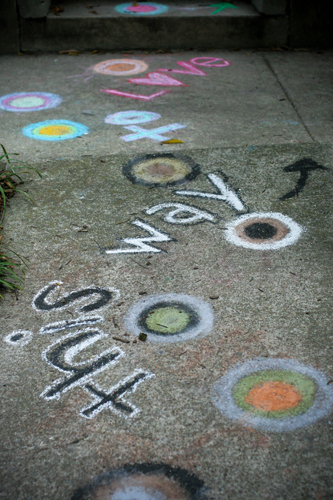 2. You head out with friends, family, kids, dogs, grandmothers, artists, whoever…and write positive messges to kids on the sidewalks in front of the elementary schools (or any schools, universities, etc.) in your neighborhood, or even your own sidewalk for the first day of school. Here are some things you can write: