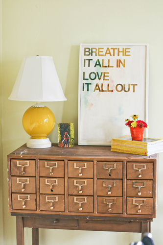 Breathe it all in, Love it all out art idea piece is compliments of this rad diy project and blog…and vintage card catalog compliments of some thrifting, yard sale-in’ besties who shared their double score. Best present ever.